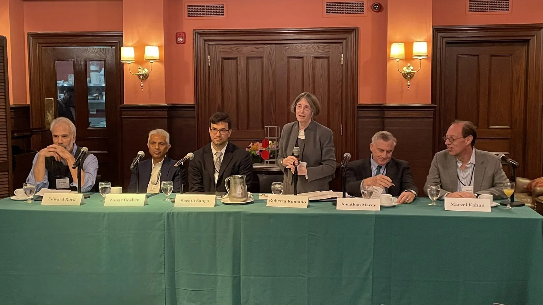 (From left) NYU Law Prof. Edward Rock, Columbia Law Prof. Zohar Goshen ’90 (LL.M.), ‘91 (J.S.D.), YLS Prof. and Ctr. Co-Dir. Sarath Sanga ’14, YLS Prof. and Ctr. Co-Dir. Roberta Romano ’80, YLS Prof. Jonathan Macey ’82, and NYU Prof. Marcel Kahan.